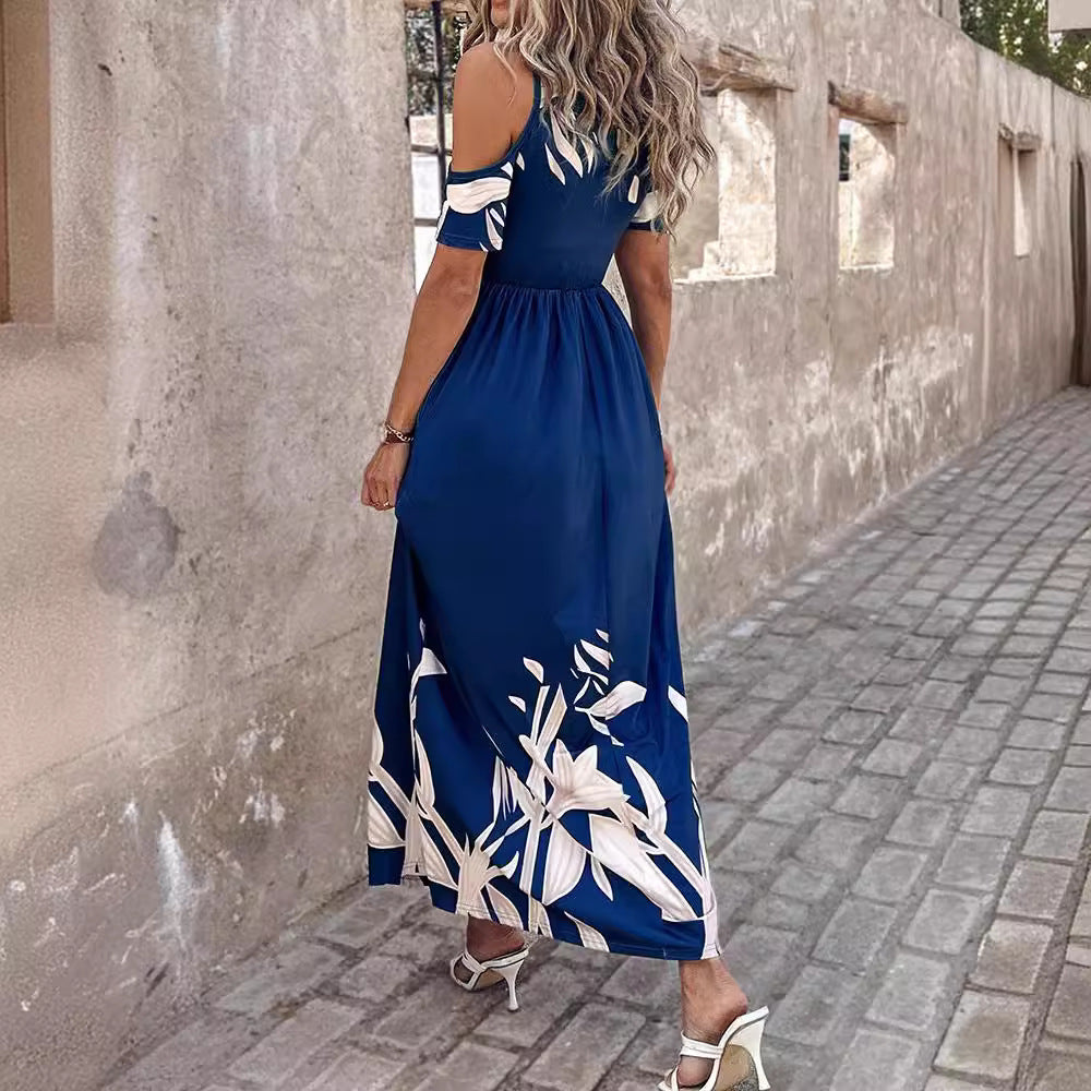 Fashion Shoulder-Baring Printed Waist-Controlled Long Dress