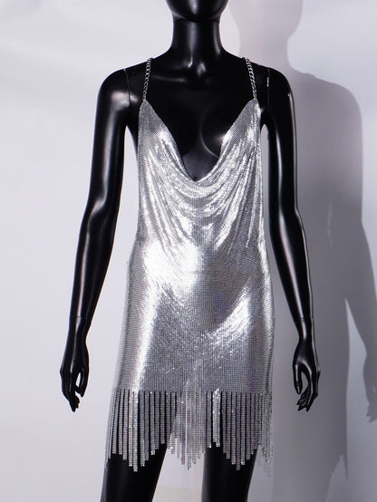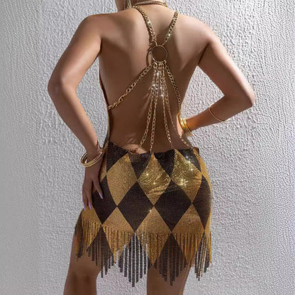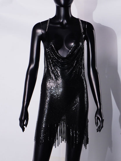Make a bold statement with the Metal Splicing Backless Sexy Dress. Designed for the confident, fashion-forward woman, this dress combines sleek metal details with an alluring backless cut to create a striking, modern look.